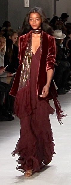 Drawing on global influences, Erin Fetherson’s collection pulls references from France, Spain and Morocco. Fringe, narrow scarves, and Moroccan babouches slippers mix together for a look that is very exotic.